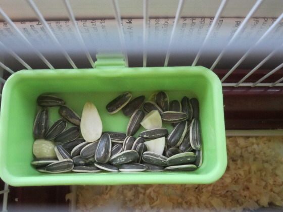 먹이통을 보니 해바라기 씨앗이 그대로 있었다. 그렇다면 40시간 동안 아무 것도 먹지 않았을까? 보통 해바라기 씨앗을 손으로 입 가까이에 주면 얼른 받아 까먹거나 통채로 입 먹이주머니에 넣는다. 그런데 집 밖으로 나왔지만, 먹이에 대한 아무런 반응을 보이지 않았다. 그리고 곧 야자수 열매 속으로 들어가 더 이상 나오지 않았다.