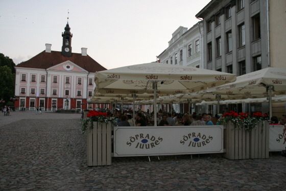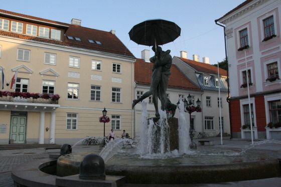 이 시청 광장에는 우산 아래 입맞춤하는 대학생 한 쌍이 있다. 타르투의 인기 조각 작품이다.