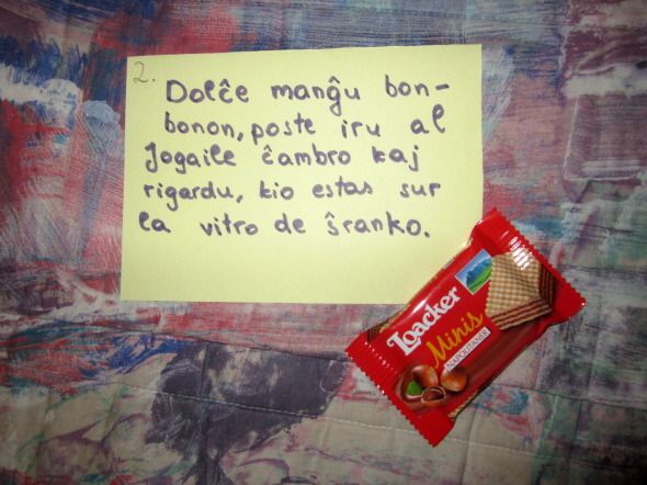 보통 아내는 여러 날 동안 집을 비우면 냉장고에 음식을 남겨놓지 않는다. 오는 도중에 가게에 들러 빵, 치즈, 상추, 토마토, 복숭아 등을 샀다. 아파트 현관문을 열고 들어오니 복도에 의자가 하나 놓여있었다. '천장에 있는 전구를 교체하다가 그만 의자를 제자리에 갖다놓지 않았구나'라고 생각했다. 그런데 가까이 가보니 노란 쪽지가 붙여져 있었다. 쪽지에 사용한 언어는 아쉽게도 한국어가 아니라 국제어 에스페란토다.