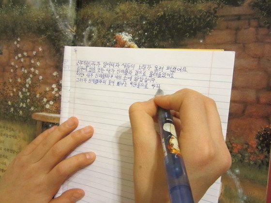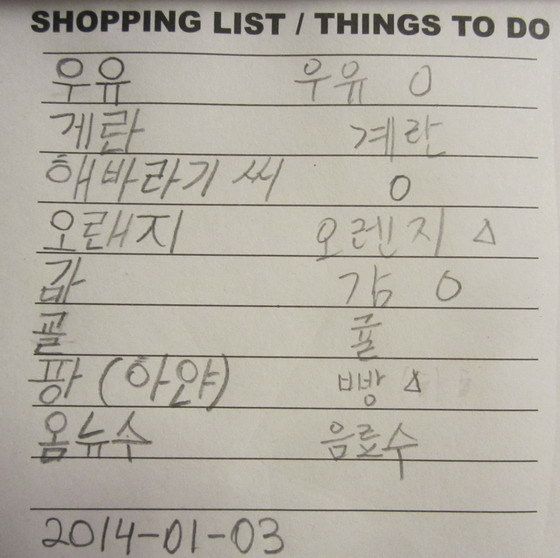 이렇게 딸아이는 부엌에서 힘들게 쇼핑목록을 한글로 썼다.