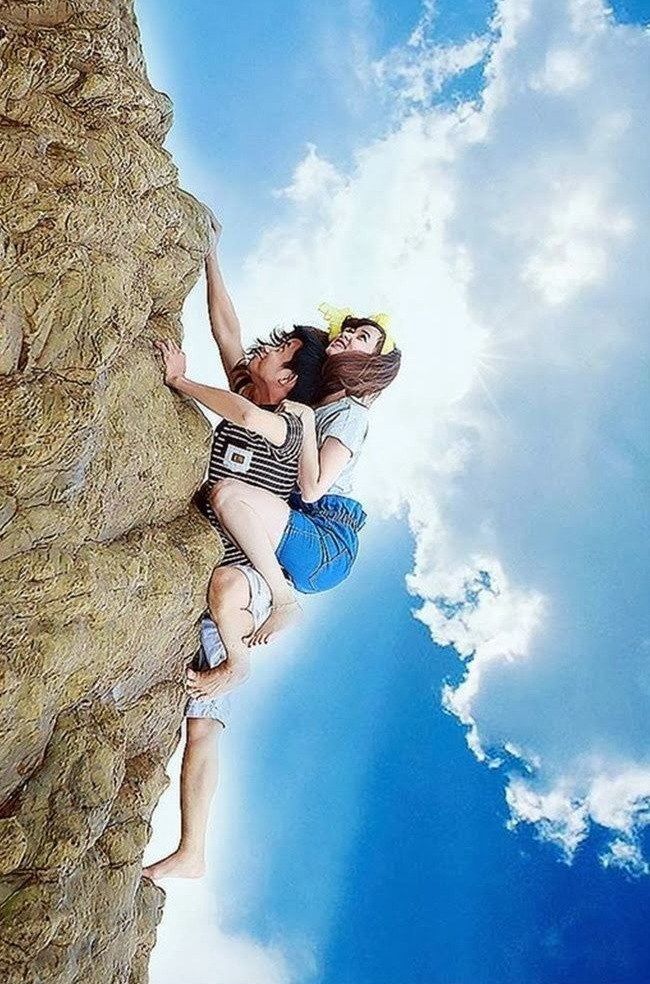 폴란드 누리꾼들 사이에 화제를 모은 사진이다. 여자 친구인 듯한 여성을 등에 업고 한 남성이 힘겹게 암벽을 올라가고 있는 모습이다. 아무런 보호장비도 없다. 보기만 해도 아찔하다.