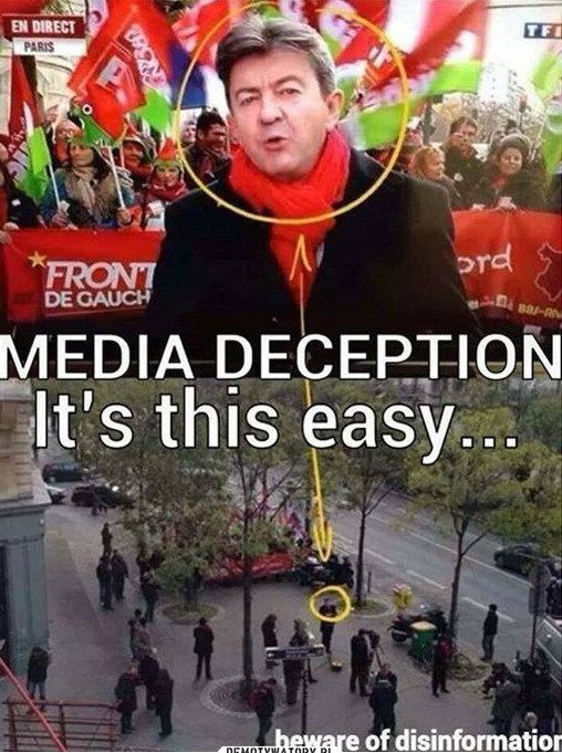 또 다른 왜곡이다. 시위하는 모습을 전달하는 언론보도이다. 선도자 뒤에는 수많은 사람이 뒤따르는 것처럼 보인다. 하지만 알고보면 그렇지가 않다.