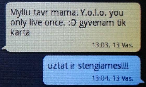 "엄마를 사랑해. Y.o.l.o. 인생은 한 번이야. 우린 한 번만 살아."