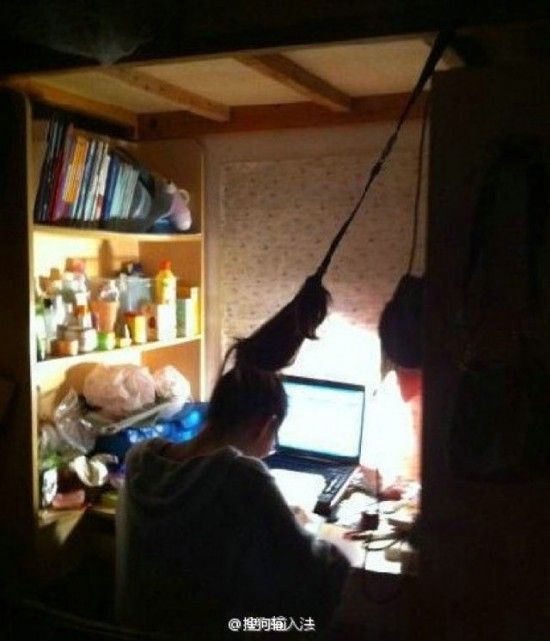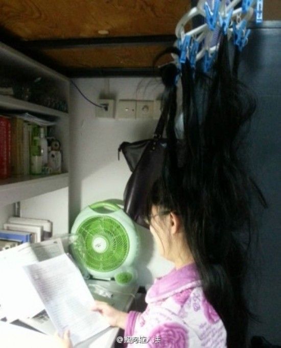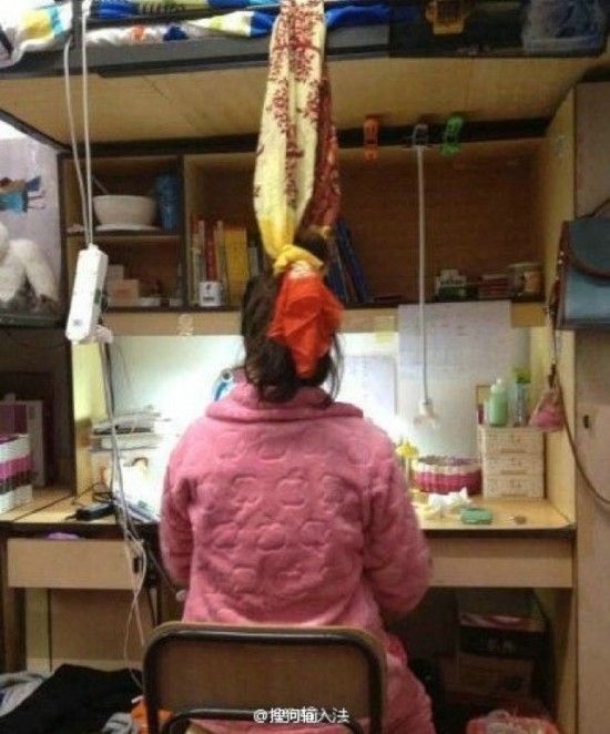 중국 여대생들의 특이한 공부법이 유럽 폴란드 누리꾼들 사이에 화제가 되고 있다. 이들 여대생들은 자신의 머리카락을 도구를 이용해 천장에 묶고 공부하고 있다. 바로 졸음방지책이다.