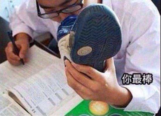 그렇다면 여자는 묶을 머리카락이 있지만, 남자는 어떻게 할까? 한 남학생이 신발 냄새를 맡으면서 졸음을 쫓고 있다.