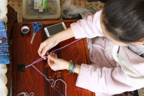 이렇게 주말에 공부에 시달리지 않고 실로 팔찌를 짜면서 시간을 보내는 딸아이가 부럽다. 한편 텔레비전이나 컴퓨터, 인터넷이 없던 옛날 옛적에 베를 짜는 선조들의 모습이 비치는 듯했다.