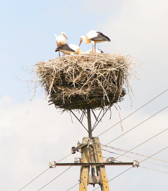 아래 사진에서 보듯이 민가 주변 전봇대 꼭대기에 있는 둥지도 흔히 만난다. 자칫하면 감전사를 당할 수 있으므로 전봇대 꼭대기에 철막대기를 세워 놓는다. 인간과 자연의 상생을 새삼스럽게 깨닫게 한다.