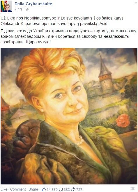 최근 달랴 그리바우스카이테 대통령은 우크라이나를 방문해 양국간 상호협력을 논의했다. 리투아니아로 귀국한 후 그는 자신의 페이스북 계정에 우크라이나에서 받은 선물을 공개했다. 다음과 같이 글을 남기고 선물로 받은 초상화를 올렸다.