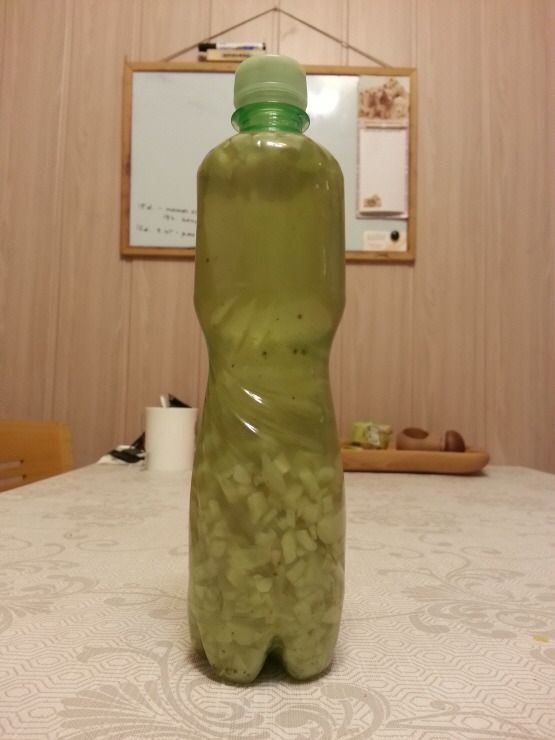 자세히 보지 않아도 마늘 조각임을 쉽게 알 수 있다. 생마늘을 조각 내어서 밑에 넣고 그 위에 40도짜리 술 보드카를 부었다. 한마디로 마늘주다. 사위가 술을 그렇게 좋아하지 않는 것을 아시는데 왜 이 마늘주을 선물했을까?