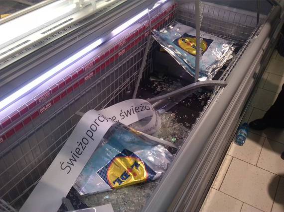 먼저 폴란드의 중부에 있는 도시 시에라즈(Sieradz) 리들 (Lidl) 상점의 할인 판매장이다. 몰려드는 인파 속에 한 여성이 잉어를 판매대에서 꺼내 계속 뒤로 던진다.