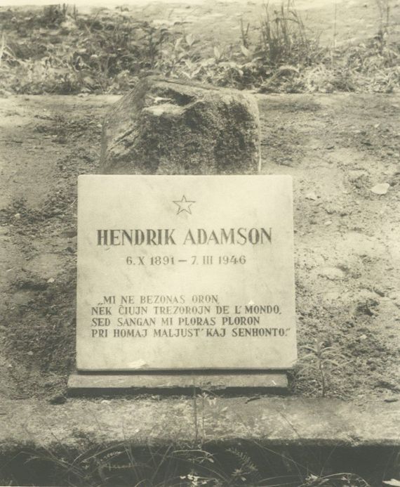 최근 세계 에스페란토인(에스페란토 사용자)들 사이에 화제가 된 묘비명이 하나 있다. 묘비명의 주인공은 헨드릭 아담손(Hendrik Adamson)이다. 그는 1891년 태어나 1946년 사망한 에스토니아 사람으로 초등학교 교사이자 시인이다. 1930년경 에스페란토인이 되어 에스페란토 원작 문학 활동을 활발하게 했다.