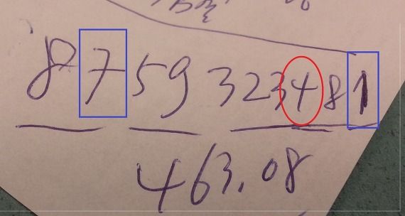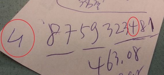 바로 위에 붉은 색으로 동그라미를 한 것이 숫자 4이다. 어떤 사람들은 한치의 의문도 일어나지 않고 숫자 4로 알 것이다. 그런데 숫자를 다루는 은행원이 이를 못 알아보다니...