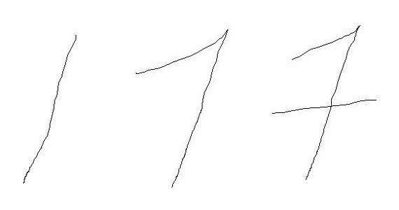 ▲ 일반적으로 표기하는 숫자 1(왼쪽), 유럽 사람들이 흔히 표기하는 숫자 1(가운데), 유럽 사람들이 흔히 표기하는 숫자 7(오른쪽).