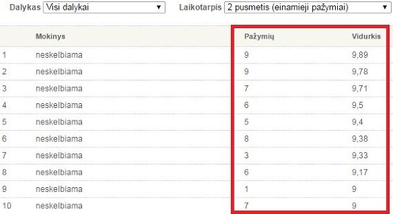 리투아니아 학교는 상대평가제를 취하고 있다. 자녀의 학업성적 확인은 인터넷을 통해 쉽게 확인할 수 있다. 7학년생(중학교 1학년생)인 딸아이의 학급의 1학기 종합성적을 살펴보자.