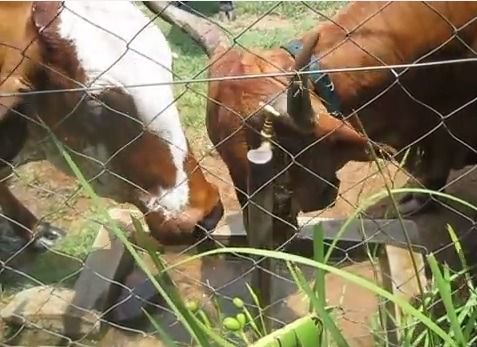 목에 방울을 단 소가 자신의 뿔로 잠겨 있는 수도관을 틀어 물을 마신다.