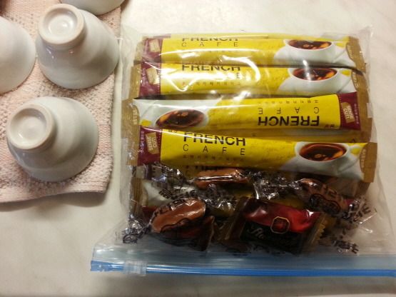 차 덕분에 이렇게 믹스커피도 한 봉지 가득 선물로 받게 되었다. 뭐니해도 아기자기한 다기는 휴대하기가 아주 쉽다. 이제 현지인 친구집 등을 방문할 때도 이것을 가져가 함께 차를 마실 수 있을 것 같다. 하지만 기본이라도 먼저 다도를 익히는 것이 급선무이다. 이 자리를 빌어서 다기를 선물한 분에게 다시 한번 감사드린다.
