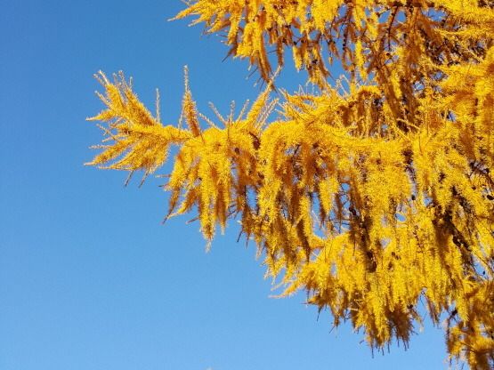 낙엽송 잎 또한 눈부시게 하는 황금빛으로 변해 노란색 물결에 동참하고 있다.