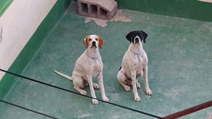 앞집 지붕에 올라온 개 두 마리가 "저희도 마음껏 바깥세상으로 나가고 싶어요"라고 말하는 듯하다.