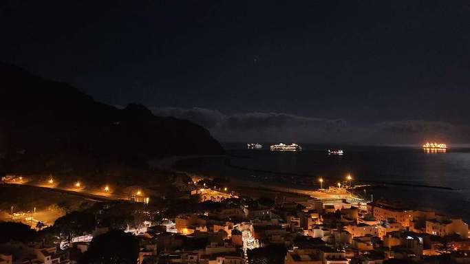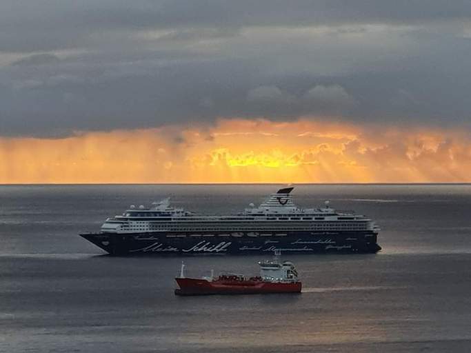 그가 즐길 수 있는 장면 중 하나가 일출이다. 바다에는 크루즈선 두 대가 정박되어 있다.