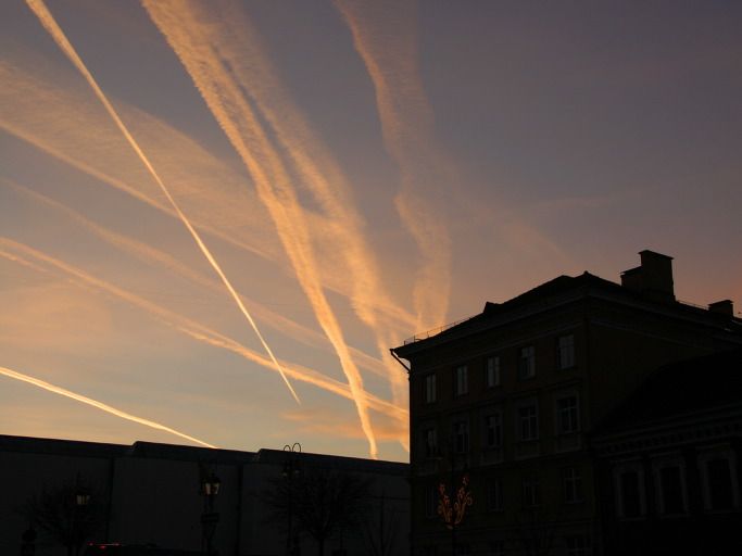아래 사진은 코로나19 이전 유럽 리투아니아 빌뉴스에서 자주 보는 맑은 날의 하늘 모습이다. 리투아니아 상공은 특히 동북 아시아에서 시베리아를 거쳐 유럽 대륙을 잇는 비행기 노선의 하늘길이다. 이처럼 평소 하늘에 비행기 발자취가 수두룩하다.