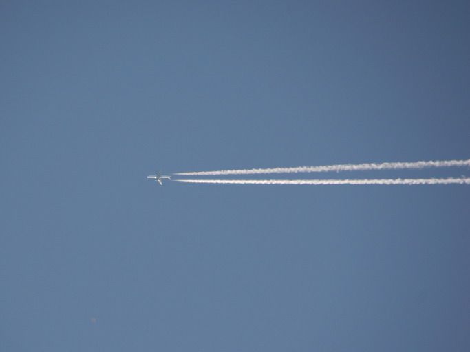 바로 비행기의 하얀 꼬리구름이다. 이는 엔진이 내뿜는 매연이 아니다. 비행기 엔진에서 방출되는 뜨거운 배기 가스와 대기의 차가운 온도가 함께 만나서 생기는 구름이다.