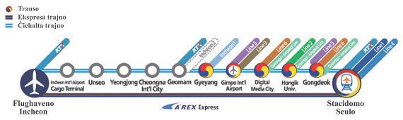 Necesas veturi unue per trajno kaj poste per metroo. Estas du specoj de trajno. Unu estas ekspresa trajno luksa kaj la alia estas ĉiehalta trajno normala. Ambaŭ trajnoj veturigas vin al la stacidomo Seulo, kiu distancas 58 kilometrojn de la flughaveno. Bonvolu atenti, ke ilia kajo estas malsama.