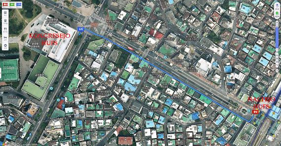 Dekstreniĝu ĉe la strato, kaj post 5-minuta piediro vi atingos la kongresejon maldekstre tuj post la ĉefenirejo de Hankuk Universitato de Fremdaj Studoj.