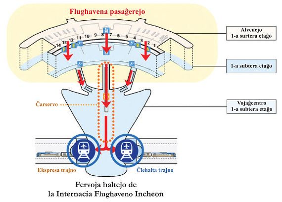 Post 10-20 minutoj vi povas alveni al la vojaĝcentro de AREX (Travel Center of Airport Railroad) kaj al la fervoja haltejo.