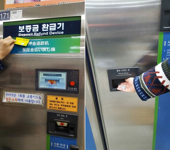 Ne forgesu preni la kaŭcion de 500 ŭonoj. Enmetu la veturkarton en la redonan maŝinon (Deposit Refund Device) kaj falos monero aŭ moneroj.