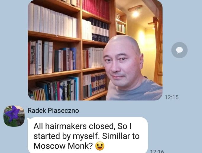 이런 생각을 하고 있는 무렵 이웃 나라 폴란드에 사는 현지인 친구가 카카오톡으로 사진을 보내왔다. 내용인즉 "이발소가 다 문 닫아서 스스로 머리깍기를 시작했다. 어디 (지난 가을에 같이 만났던) 모스크바 교무님(원불교 성직자)하고 비슷해?"
