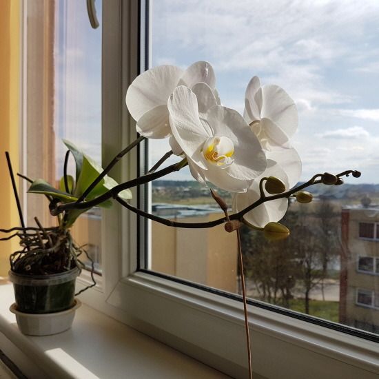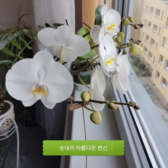 거실 창틀에 잘 자라고 있는 서양란의 하얀꽃이 시선을 끌었다.
