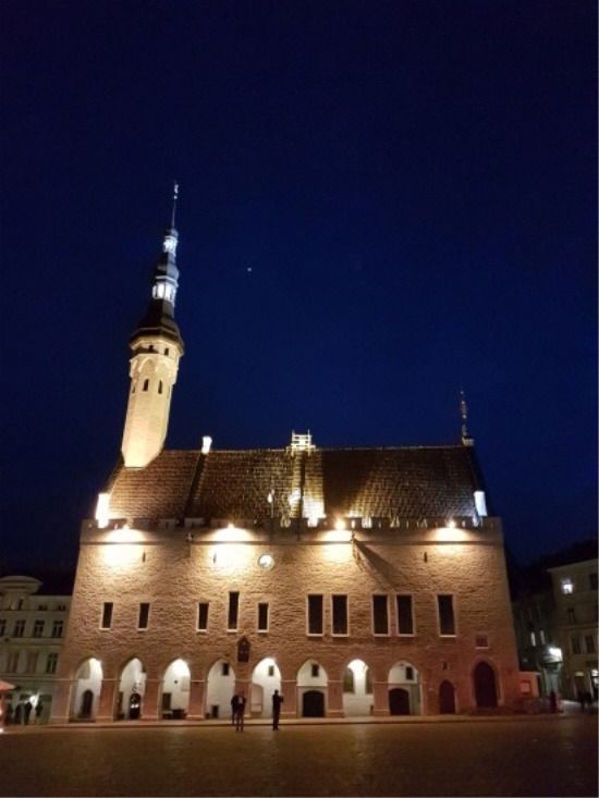가운데 솟은 첨탑 건물이 탈린 시청사이다.