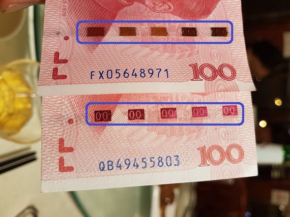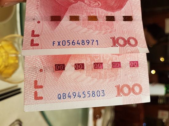 그의 설명에 따르면 이렇다. 일단 선명도에서 차이가 난다. 더 중요한 것은 바로 다섯 개로 되어 있는 네모칸에 숫자가 쉽게 드러나지 않아야 진짜다. 복사하면서 그 숫자가 비친 것이 가짜다. 사진에서 위에 있는 지폐가 진짜고 아래는 있는 지폐가 가짜다. 그의 설명은 집으로 돌아올 때 방문한 상해에서 도움이 되었다.