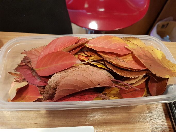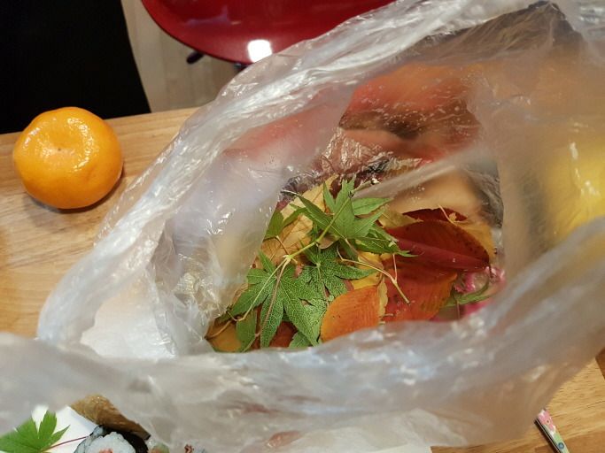 지인은 가을이 되면 단풍잎이나 곱게 물든 나뭇잎을 따서 냉장실과 냉동실에 보관해 놓는다고 한다. 음식을 다 만든 후에 접시 빈 자리에 나뭇잎을 올려 시각적으로도 음식을 즐길 수 있도록 신경을 쓴다고 한다. 비닐봉지는 냉장실에 보관하는 나뭇잎이다.