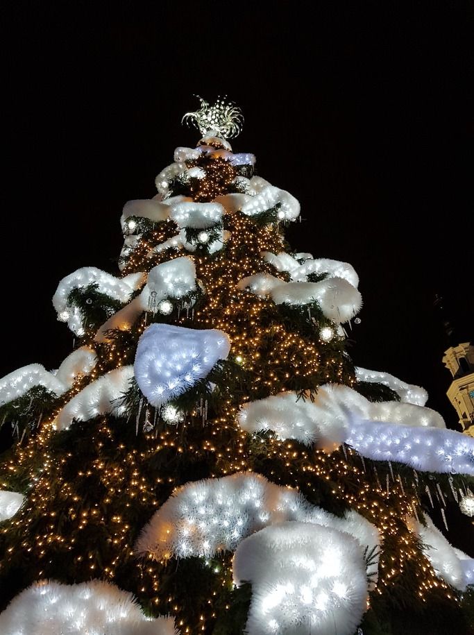 눈이 내려 벌써 다 녹았는데도 크리스마스 트리에는 눈 더미로 여겨지는 것이 쌓여 있다. 도대체 무엇으로 저런 장식을 해냈을까 궁금해졌다. 광장에 있는 크리스마스 트리의 낮 모습이다.