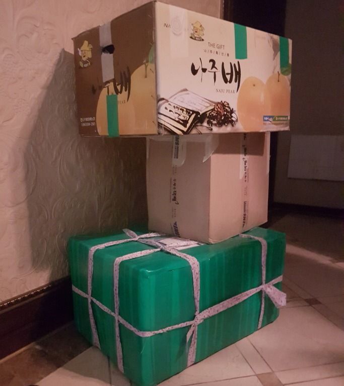 그 후 여러 날을 여기저기로 돌아다니다가 이제 한국 체류 마지막날이 되었다. 이날 밤 10시가 넘어서야 우체국 택배가 도착했다. 지인이 보낸 상자가 셋이나 되었다. 녹색 테이프로 꽁꽁 감싼 상자가 바로 김치다. 무게를 재어보니 24.5kg(김치 20kg + 기타 음식과 상자 무게)이나 나갔다. 이를 어찌하오리... 감사한 마음이 충만했지만 과연 이 김치 상자를 무사히 수화물칸에 실어 집까지 가져 갈 수 있을 지 심히 걱정 되었다.