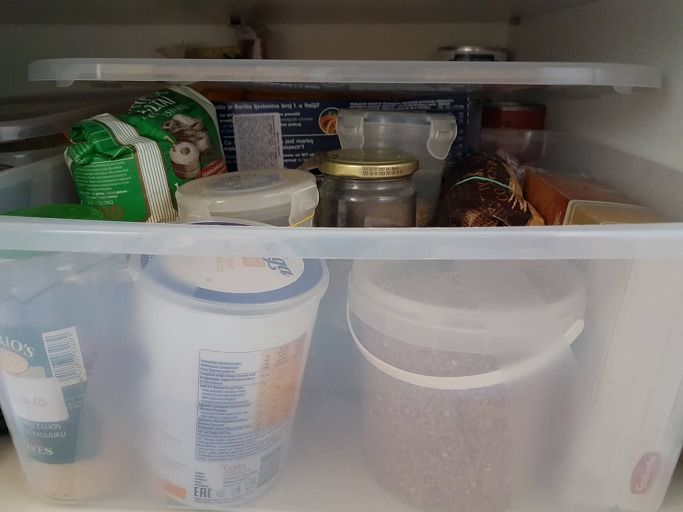 우리 집의 물건 사기와 보관하기 문제를 쉽게 해결해 줄 수 있는 방법을 눈앞에 보게 되자 감탄이 절로 나왔다. 빌뉴스 집에 있는 아내에게 우리도 이렇게 한번 해보자라고 사진을 찍어 보냈다. 막상 집으로 돌아와 우리 집 부엌 환경을 살펴 보니 이 방법을 즉각 실행하기엔 적합하지 않음을 알게 되었다. 플라스티병 재활용도 할 수 있고 또 무엇이 얼마나 남아 있는 지를 쉽게 확인할 수 있는 이 방법은 부엌 환경이 되면 꼭 실행해 보고 싶다.
