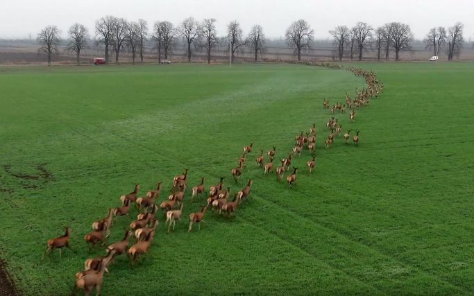 최근 대규모 사슴떼의 이동이 드론에 찍혀 화제가 되고 있다. 헝가리 남부 지방 모하치(Mohács) 샤토르헤이(Sátorhely)에 낮에 대이동하는 모습이다.