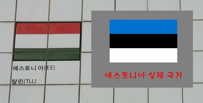 그런데 사진 속 발트 3국의 국기가 다 실제와는 완전 딴판이다. 에스토니아는 위로부터 파란색, 검은색, 하얀색인데 조형물 국기에는 빨간색, 하얀색, 초록색이다.