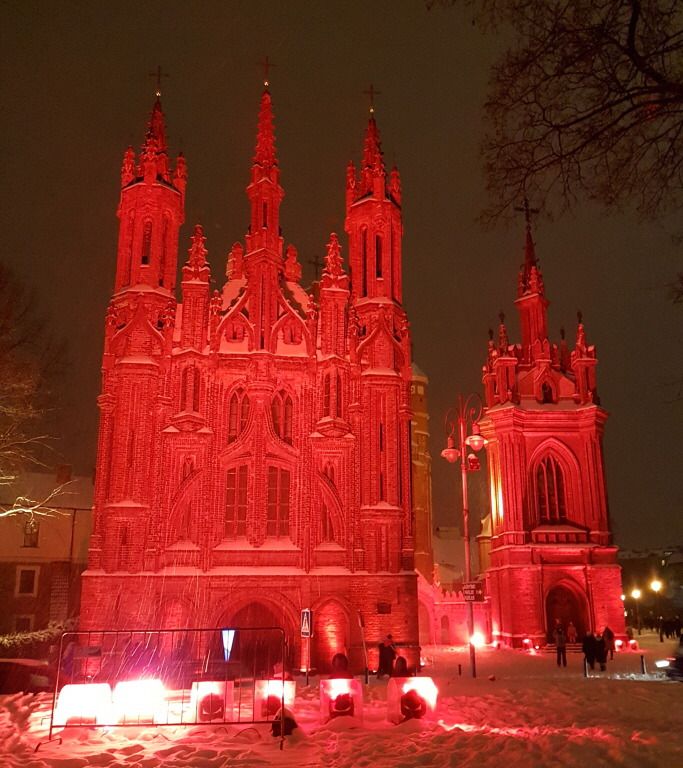 붉은 벽돌 안나 성당이 붉은색 조명을 받고 있다.