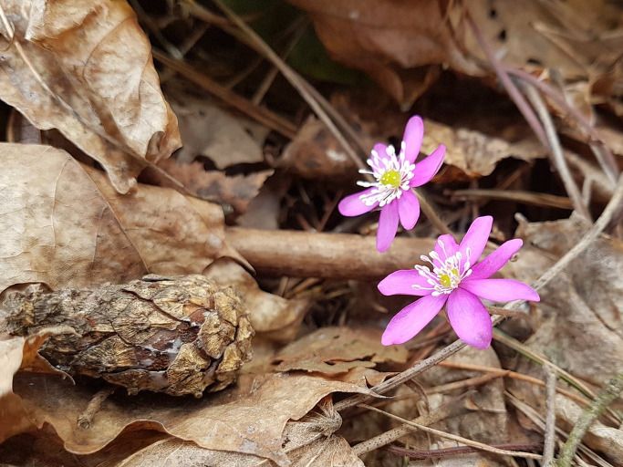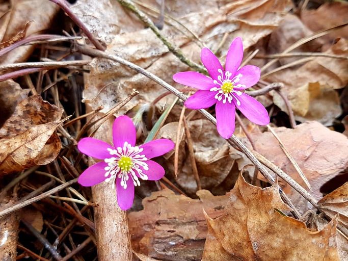 분홍색 노루귀꽃 두 송이가 사이좋게 나란히 군계일학으로 색바랜 낙엽을 뒷배경으로 곱게 피어나 있다.