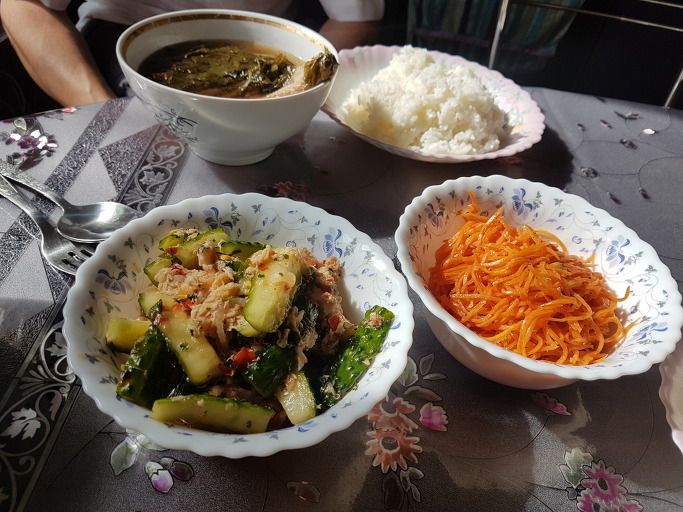 10여일 동안 고려인 집에서 내가 먹은 음식들을 아래 소개한다. 한반도를 떠나서 산 지 150여년 세월이 흘렀지만 이 집 음식들은 여전히 밥과 반찬과 국으로 이루어진 한국식이다. 첫날 점심 식탁에 오른 음식이다.