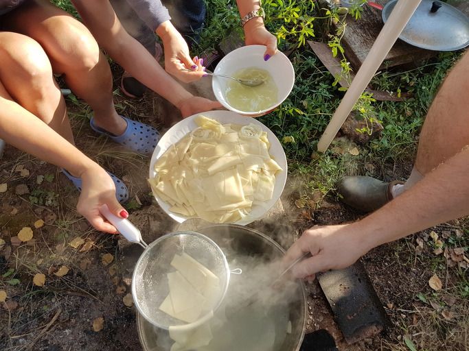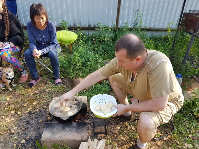 각자 맡은 일을 한다. 숯불을 피우고, 양파를 썰고, 감자를 깎고, 식탁을 차리고...