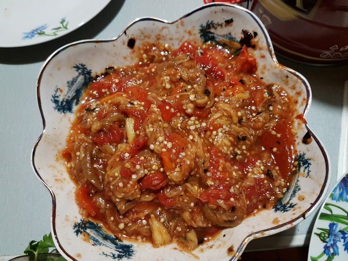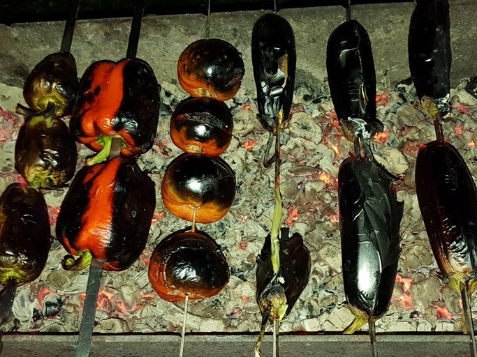벌써 늦은 저녁을 먹어야 할 때다. 이제 숯불에 구운 양고기 즉 샤슬릭을 먹을 차례다. 먼저 숯불에 피망, 토마토, 가지를 굽는다. 그냥 먹어도 될텐데 왜 구을까?