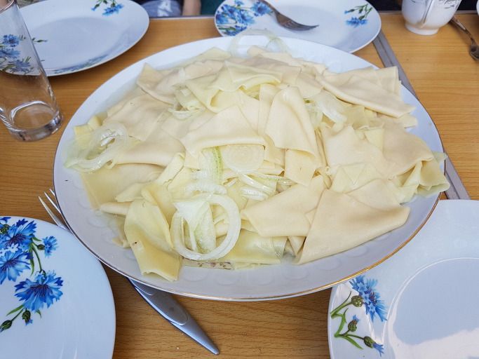 남아 있는 양고기 육수에 아주 얇고 네모난 파스타를 넣고 끓인다.
