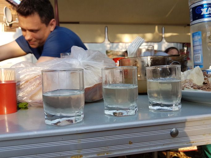 보드카 반주가 없을 리 없다. 주량에 따라 술잔 속 보드카 양의 높이가 도레미다.