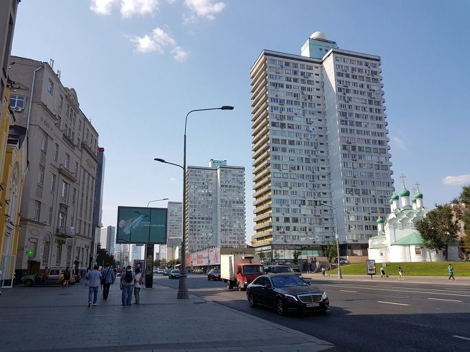 신 아르바트 대로 사거리에서 좌회전을 해서 걸어가니 롯데 백화점과 롯데 호텔이 나온다. 조금 더 걸으면 마천루 스탈린 7자매 중 하나인 러시아 외부성 건물을 만난다. 지하도를 통해 반대편으로 나와 아지무트 호텔 앞에서 찍은 사진이다. 이 건물은 27층 172미터로 1951년 완성되었다. 스탈린 7자매는 스탈린이 스탈린식 고딕 양식으로 모스크바를 재건하려는 데서 세운 대표적인 고층 건물을 말한다.