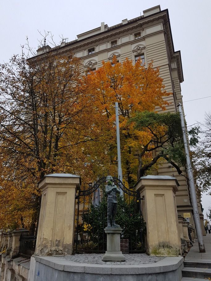그가 어린 시절 살았던 집 바로 옆에 이 조각상이 세워져 있다. 그의 소설 《새벽의 약속》(1960)에 나오는 소년을 묘사하고 있다. 이 소설에서 그는 빌뉴스에서 보낸 어린 시절과 발렌티나 소녀에 대해 이야기 하고 있다. 그는 소녀의 관심을 끌기 위해 고무신을 물어뜯어 먹는다.