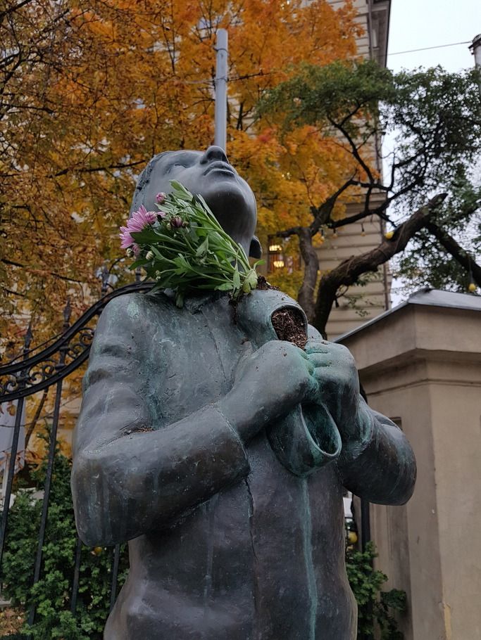 며칠 전 산책길에 이 조각상 쪽으로 바라보니 턱밑에 조화인지 생화인지 꽃이 놓여 있었다. 보통 기념상에 관련한 사람들을 추모하거나 기념하기 위해 기단에 꽃을 놓는다. 그런데 턱 밑에 꽃이라니...