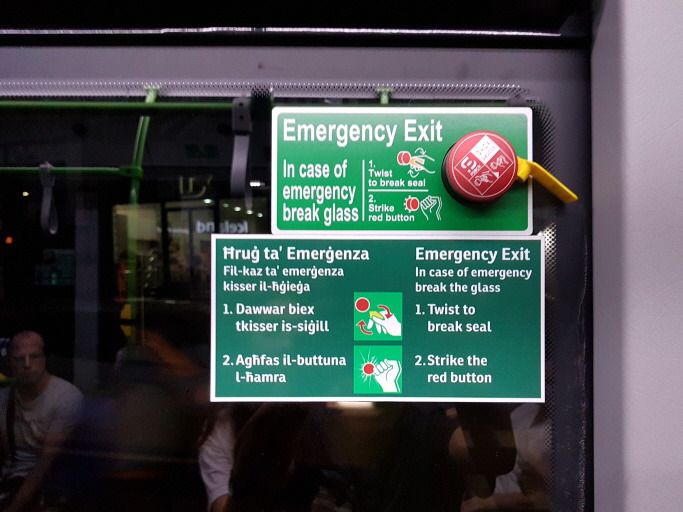 한편 비상시 버스 유리창 깨는 방법이 특이하다. 보통 유리창 옆에 조그마한 망치가 붙어 있다. 그런데 이번 몰타에서 본 것은 망치가 아니라 붉은 단추다. 비상시 노란색 봉인을 틀어서 깨고 붉은 단추를 치면 유리창이 깨진다.